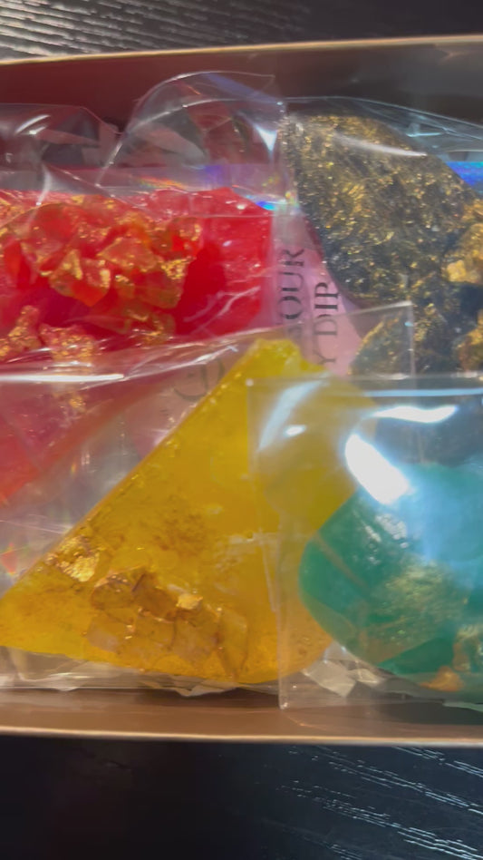These edible gems are unlike any candy you've tasted. Each piece features a crisp, glass like sugar shell that cracks like crystal and reveals a soft, refreshing jelly center. They tumble like stones, sparkle like jewels, and taste like pure delight - inspired by your favourite desserts, fruits, and luxury treats.
