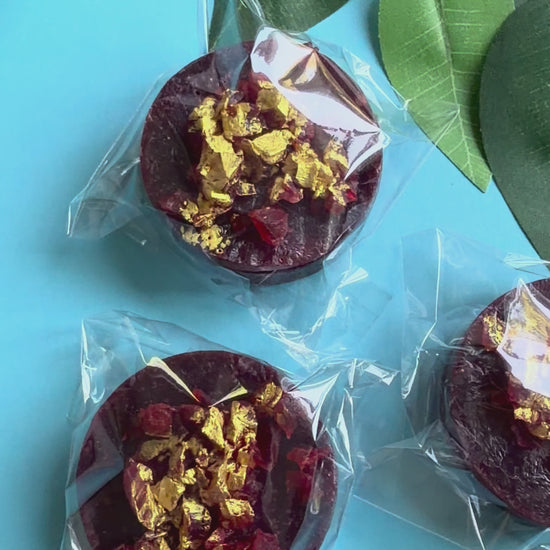 Indulge in the ultimate fusion of luxury, flavor, and texture with our brand-new creation. These handcrafted crystal candy shells shimmer with deep red velvet richness, crowned with glistening flakes of edible gold accents.