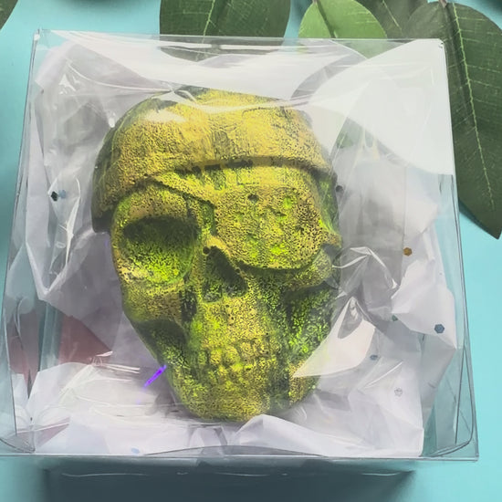 Light up your spooky season with our one-of-a-kind Glow-in-the-Dark Crystal Candy Skull! Each handcrafted skull is coated in edible, UV-reactive shimmer that glows eerily under blacklight.